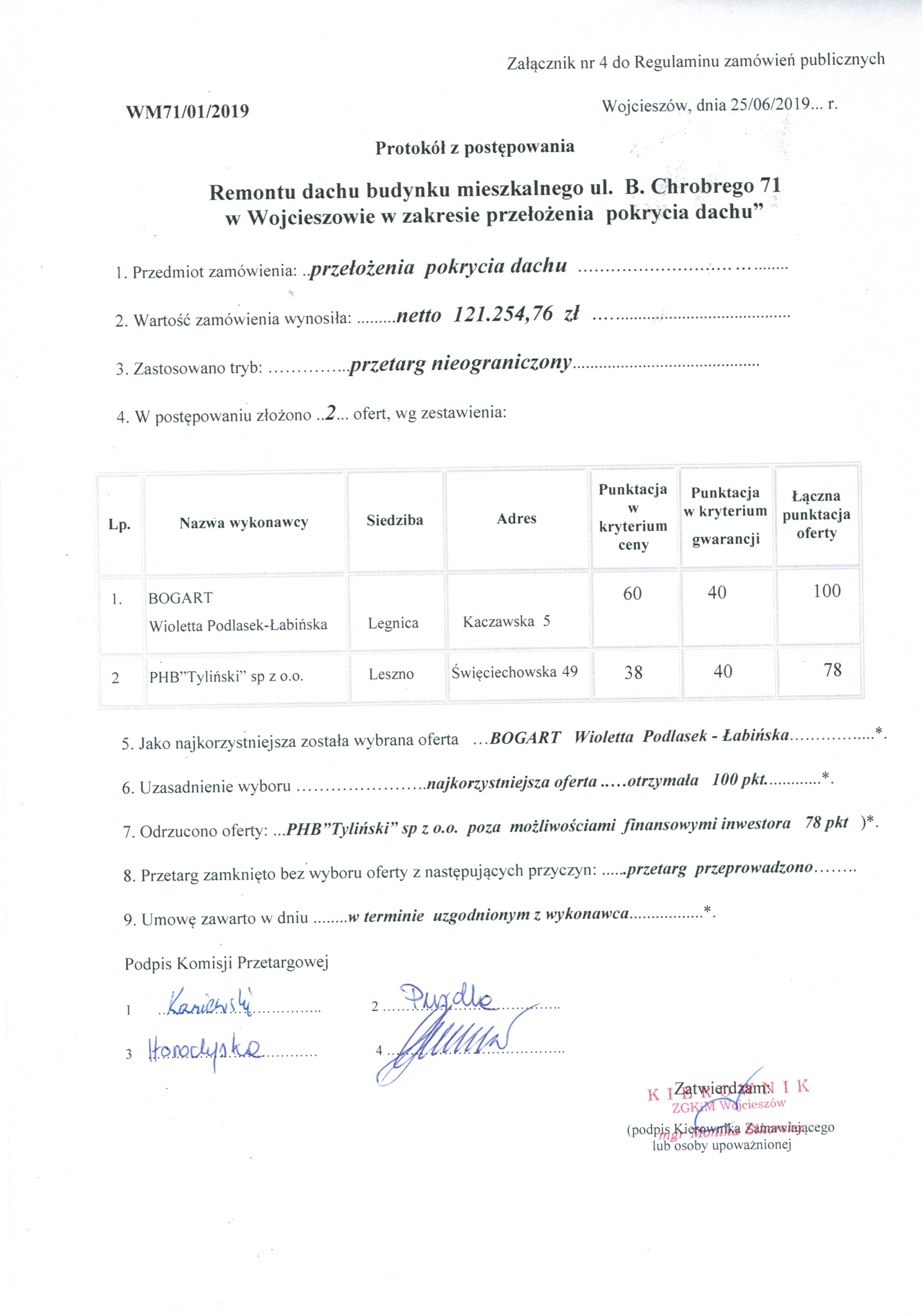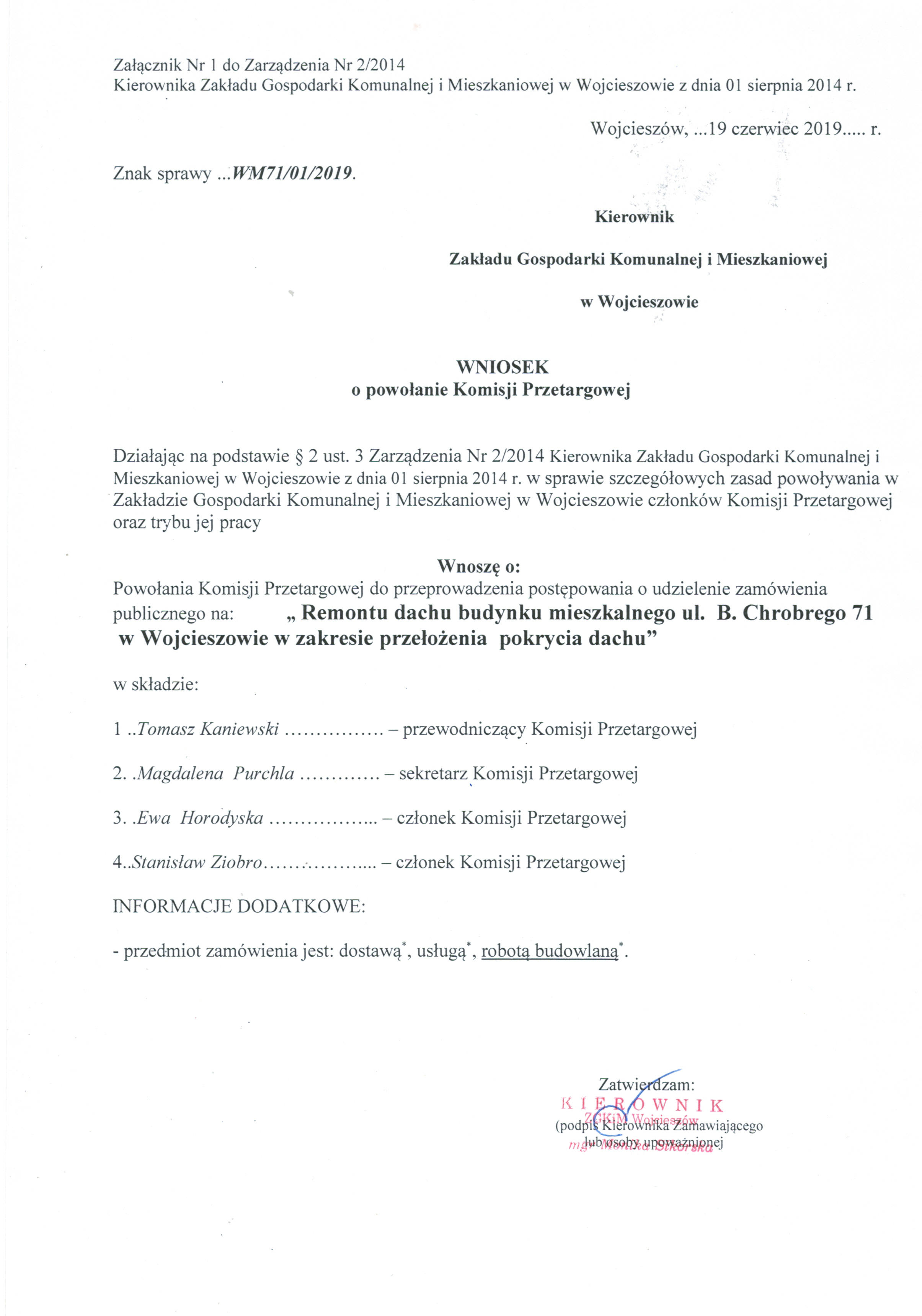 1. Remont dachu budynku mieszkalnego ul. B. Chrobrego 71 w Wojcieszowie w zakresie przełożenia pokrycia dachu.